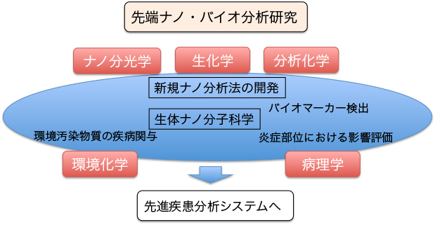 生化学・バイオ分析分野とナノ分光分析分野の専門家が協力してナノ構造体が示す新規な特性を活かした超高感度分子検出法を開発する。高感度化のために、非侵襲かつ高速な分析を可能とする分光分析技術を駆使する。病理分析、環境分析化学、核酸工学、界面化学、タンパク質分析化学の専門家の協力により、ウイルス・疾病バイオマーカーや環境汚染物質の超高感度検出をおこなう。近年社会問題となっているアルツハイマー病をはじめとするアミロイド凝集病をとりあげ、先端疾患分析システムへの展開を検討する。