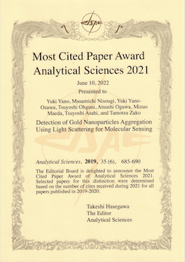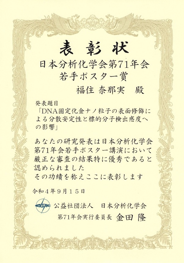Yuki Tanaka, Gen Hirao, Nanami Fukuzumi, Tsuyoshi Asahi, Mizuo Maeda, Atsushi Ogawa, Tamotsu Zako "Nucleic Acid Detection Using Cross-Linking Aggregation of DNA Density-Controlled Gold Nanoparticles" (poster)