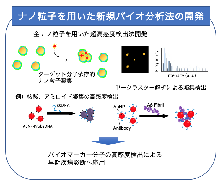 金ナノ粒子を用いた超高感度検出法を開発しています。特に、暗視野顕微鏡(DFM) を用いてナノ粒子凝集を単一クラスター観察することによる超高感度分析手法を開発し、バイオマーカー検出への応用を目指しています。これにより疾病の早期診断が可能になると期待できます。