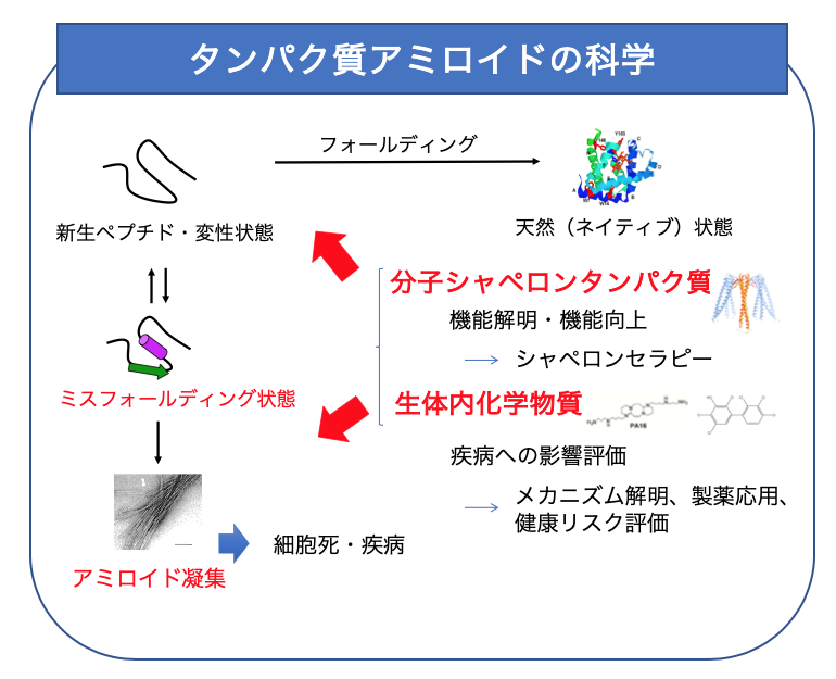 近年、タンパク質ミスフォールディング病とよばれる、天然構造が壊れ、間違ったフォールディング(ミスフォールディング)をしたタンパク質が凝集することが原因で病気が引き起こされる例が多く見つかり、社会的問題となっています。代表的な疾病であるアルツハイマー病においてはアミロイドβタンパク質(Aβ)などのアミロイド凝集体が主な病因と考えられています。